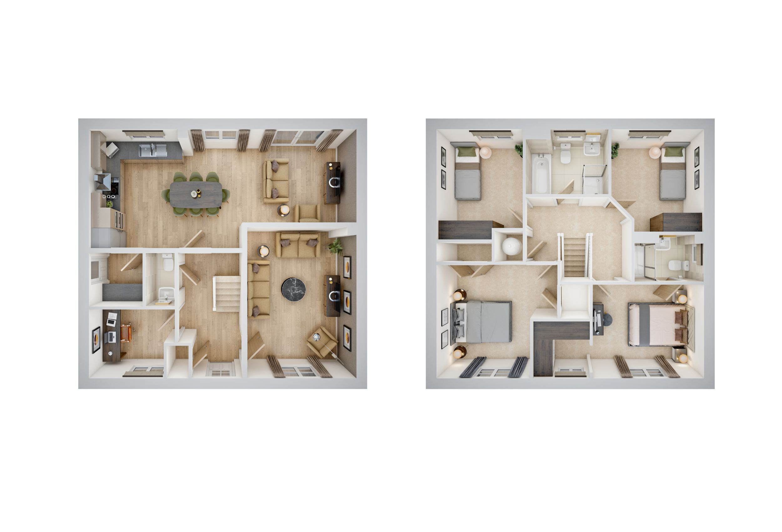 The Northam is a spacious, double-fronted home thoughtfully designed for modern family living. A bright entrance hall leads to a front-aspect study, a convenient WC, and a separate living room – ideal for relaxing or entertaining. To the rear, a generous open-plan kitchen and dining area becomes the heart of the home, with French doors opening onto the large garden. A handy utility room offers outdoor access for added convenience. Upstairs, bedroom one features built-in wardrobes and a private en-suite, while a stylish family bathroom serves a second double bedroom and two generous single bedrooms. This energy-conscious home includes an electric vehicle charging point and also benefits from a detached single garage and two parking spaces.