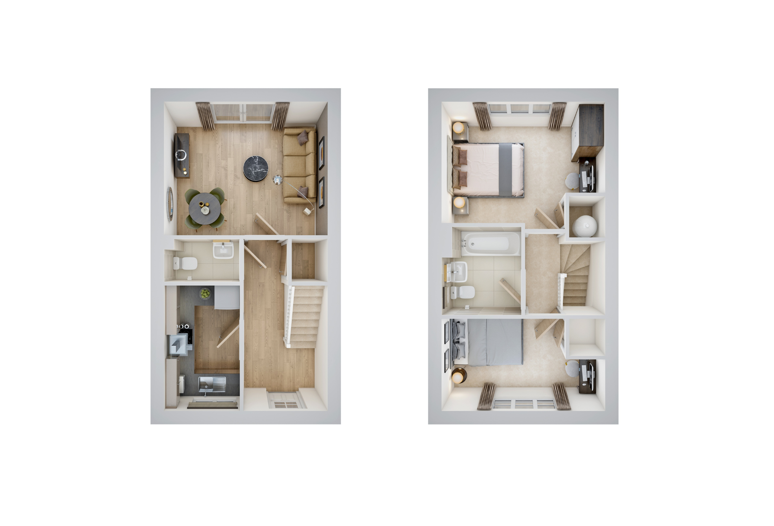 The Banbury features a welcoming entrance hall with storage and a WC, leading to a stylish front-aspect U-shaped kitchen and a bright open-plan living/dining area with French doors to a large rear garden. Upstairs, two spacious double bedrooms are served by a contemporary family bathroom, with one bedroom offering additional built-in storage. This home also includes two parking spaces.