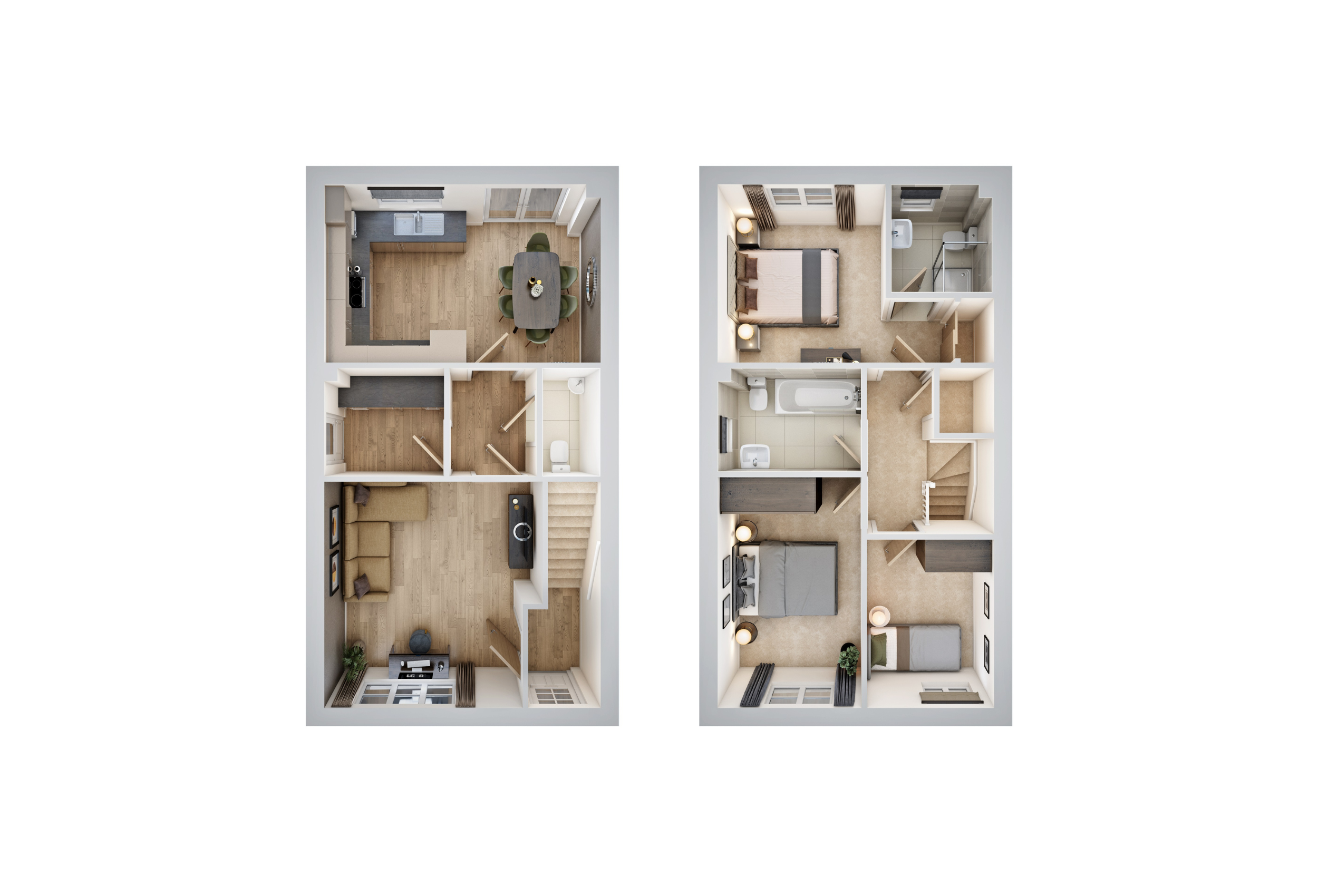 The Fern welcomes you into an enclosed entrance hall, leading to a front-aspect living room. A modest hallway provides access to a stylish downstairs WC and a dedicated utility room with outdoor access. At the back of the property, you’ll find a modern U-shaped kitchen and open-plan dining space, with French doors leading to the rear garden. Upstairs, bedroom one offers peace and privacy, benefiting from a private en-suite shower room. The landing includes an additional storage cupboard, while a contemporary family bathroom with a WC, wash basin, and bathtub serves a further double bedroom and a generous single. This home features two parking spaces.