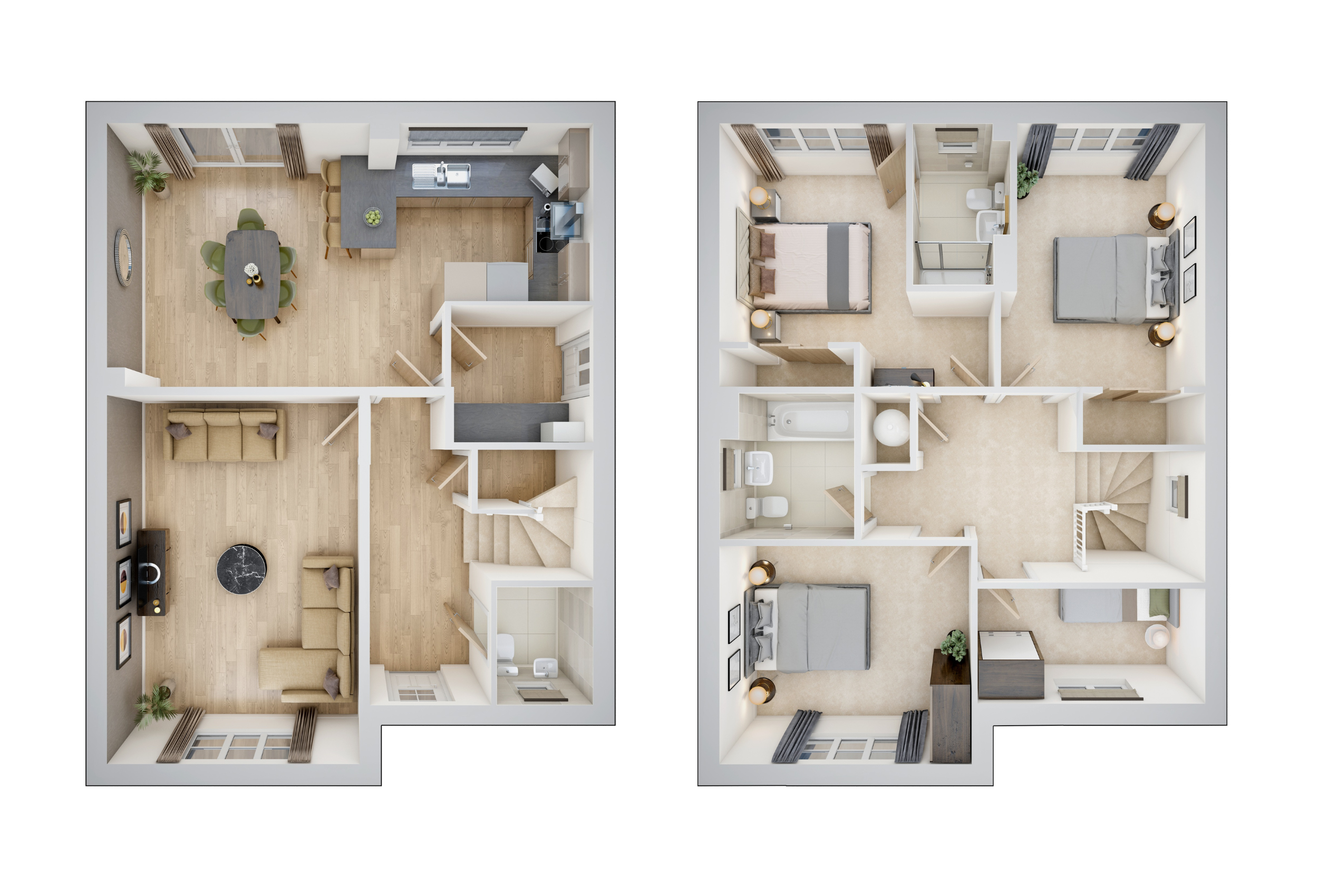 The Walnut welcomes you with a spacious entrance hall leading to a generous living room. The stylish open-plan kitchen/dining area features a breakfast bar and French doors opening to the rear garden. A dedicated utility room with outside access and a convenient downstairs WC complete the ground floor. Upstairs, a large landing connects four spacious bedrooms, including bedroom one with a private en-suite. A contemporary family bathroom serves the remaining three bedrooms. This home comes with a single garage and two parking spaces.