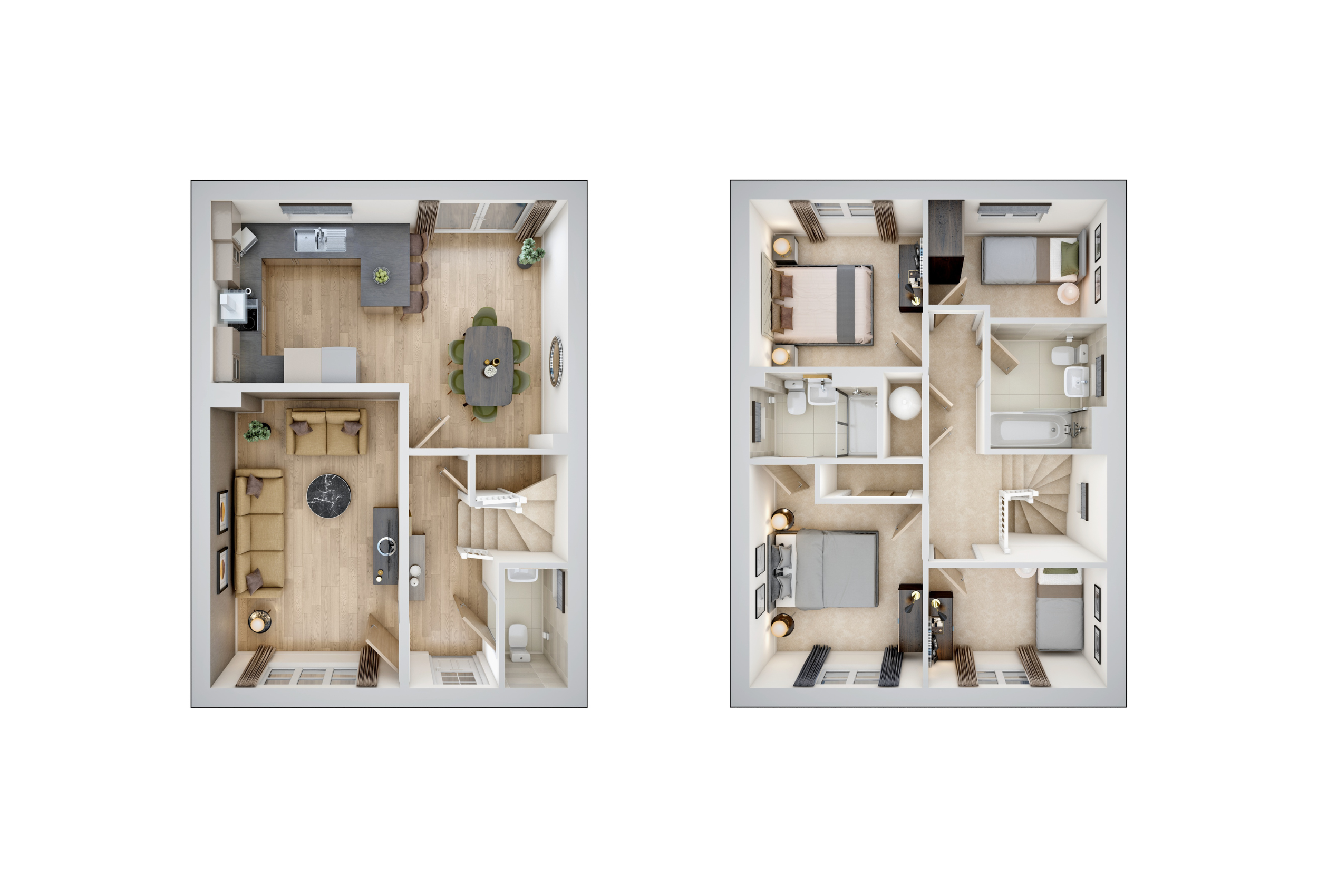 The Rowan offers a spacious, modern layout designed for comfortable family living. At the front, a generous living room provides the perfect place to relax, while additional storage and a convenient downstairs WC add everyday practicality. To the rear, a bright dual-aspect kitchen/dining area opens onto the garden through French doors, creating a light-filled, social space. Upstairs, bedroom one features built-in wardrobes and a private en-suite, while a second double and two generous singles are served by a contemporary family bathroom. This home also includes a single garage and two parking spaces.