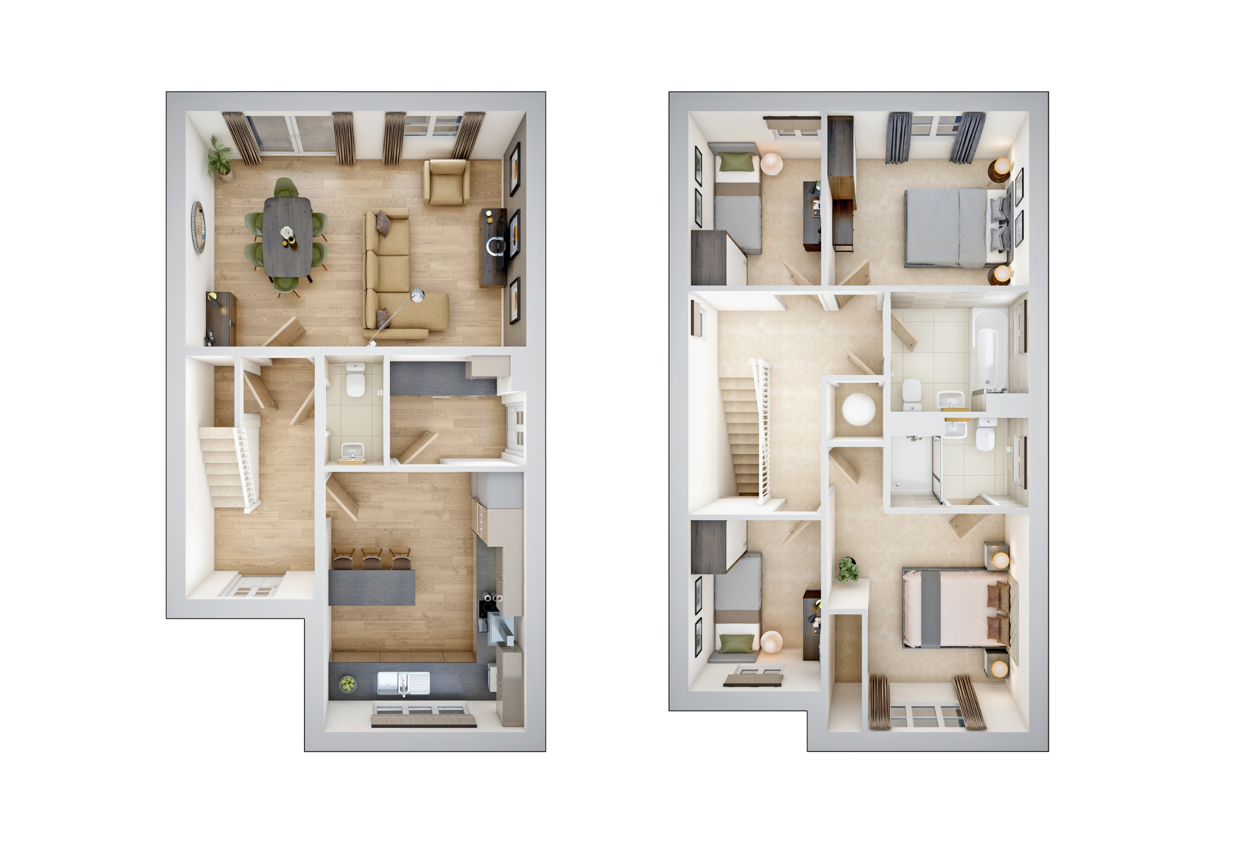The Hornbeam offers a spacious and modern layout, featuring a large front-aspect kitchen and a dedicated utility room with outside access. At the rear, a bright dual-aspect living space opens onto the large south-facing garden through French doors, creating the perfect setting for entertaining or relaxation. Upstairs, bedroom one boasts fitted wardrobes and a private en-suite, while another double bedroom and two generous single bedrooms are served by a contemporary family bathroom. This home also benefits from a single garage and two parking spaces.