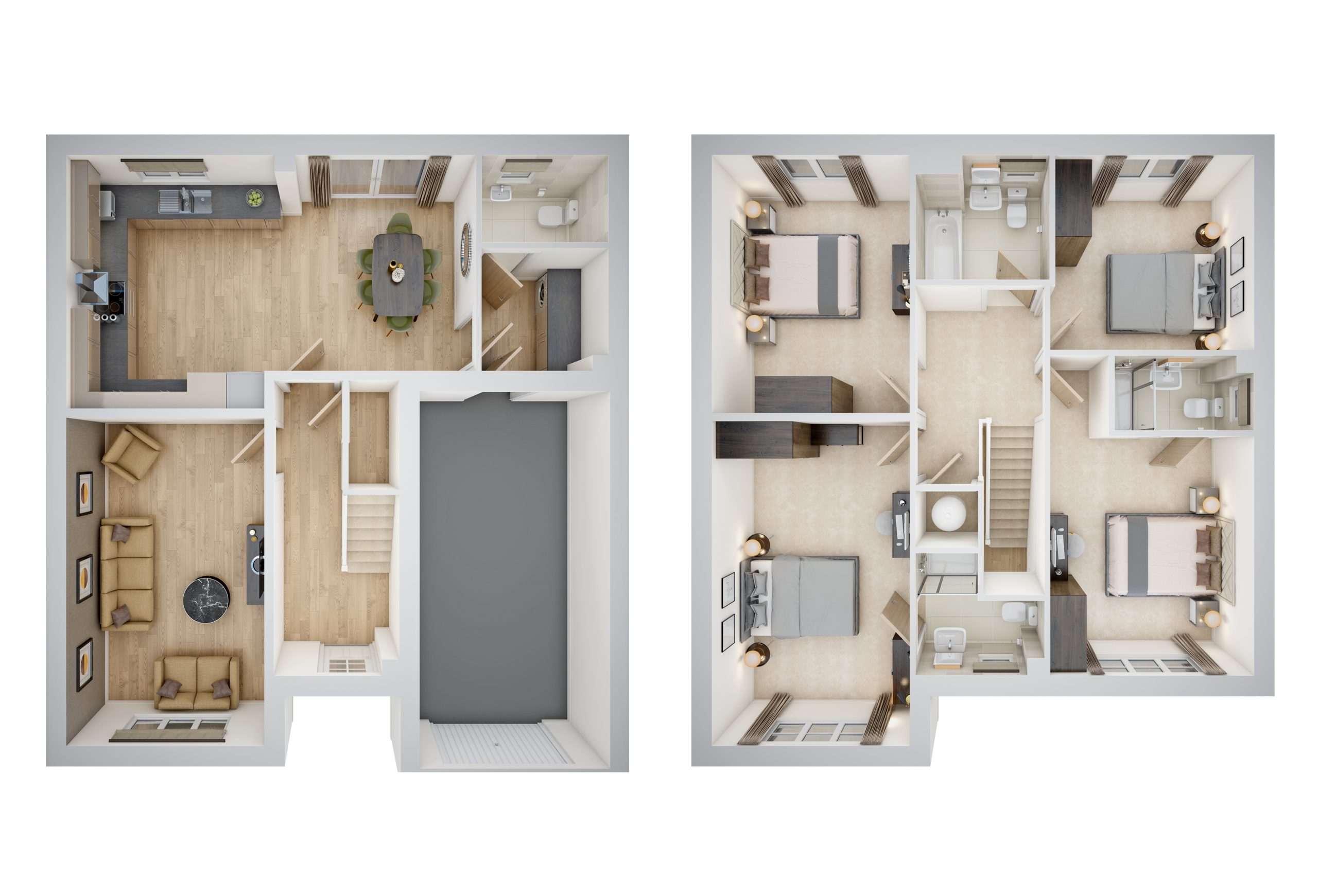 The Trentham welcomes you into a spacious entrance hall leading to a generous front-aspect living room. At the rear, a stylish open-plan kitchen/dining area features a large U-shaped layout and French doors opening to a wrap-around garden – perfect for indoor-outdoor family living. A dedicated utility room links to a downstairs WC and provides internal access to the integral garage, completing the ground floor. Upstairs, the landing connects four well-sized bedrooms, with bedrooms one and two benefitting from private en-suites. A contemporary family bathroom serves the remaining two bedrooms. This home also includes an integral garage and two parking spaces.