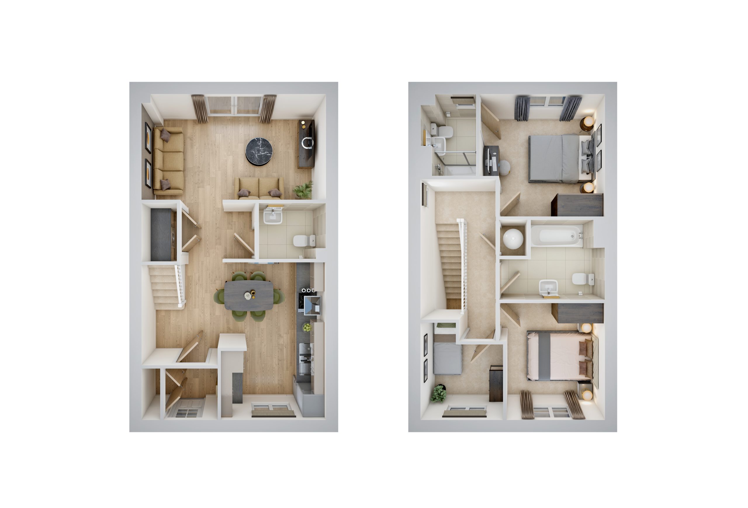 The Gosford offers generous open-plan living and a smart, family-friendly layout. An enclosed entrance hall leads to a stylish front-aspect galley kitchen with a connected dining space. At the rear, the spacious living area opens onto the garden via French doors, creating a bright and sociable space. Practical touches include a downstairs WC and handy under-stairs storage. Upstairs, a large L-shaped landing connects three well-sized bedrooms, including a main bedroom with a private en-suite, while a sleek family bathroom serves the remaining two. This home also benefits from two parking spaces.